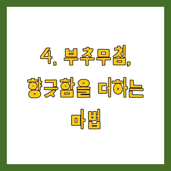 부추는 콩나물과 함께 오래 버무리면 풋내가 날 수 있습니다. 콩나물을 양념에 먼저 버무린 후, 마지막에 부추를 살짝 섞어주는 것이 풋내 없이 깔끔한 부추무침을 만드는 비법입니다. 먹기 직전에 무치면 더욱 신선하고 향긋한 부추무침을 즐길 수 있겠죠?